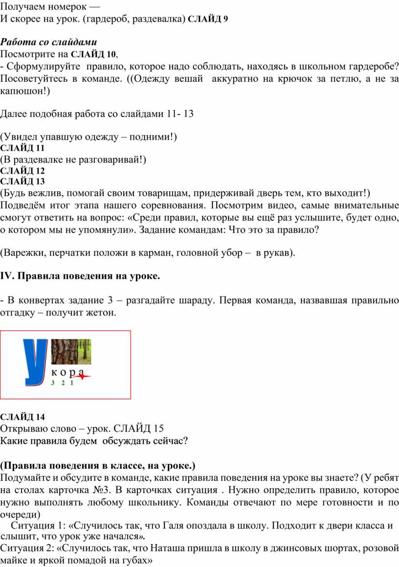 Ситуация 1: «Случилось так, что Галя опоздала в школу. Подходит к двери класса и слышит, что урок уже начался».