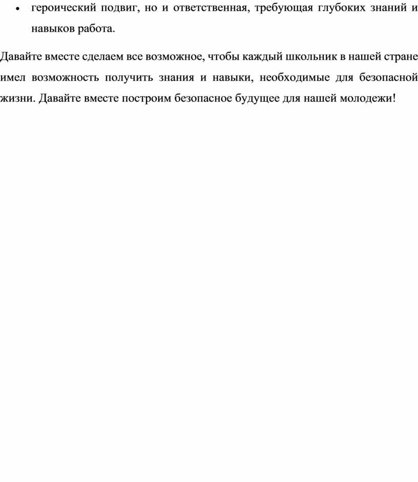 Давайте вместе сделаем все возможное, чтобы каждый школьник в нашей стране имел возможность получить знания и навыки, необходимые для безопасной жизни. Давайте вместе построим безопасное будущее для нашей молодежи!