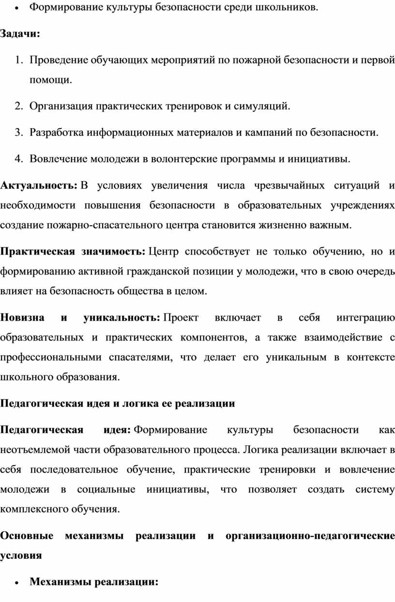 Педагогическая идея: Формирование культуры безопасности как неотъемлемой части образовательного процесса. Логика реализации включает в себя последовательное обучение, практические тренировки и вовлечение молодежи в социальные инициативы, что позволяет создать систему комплексного обучения.