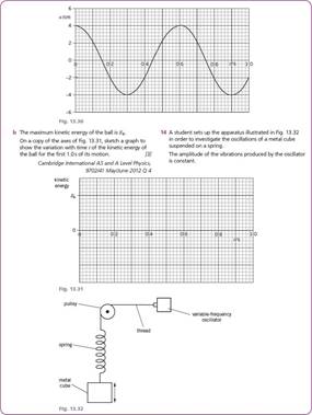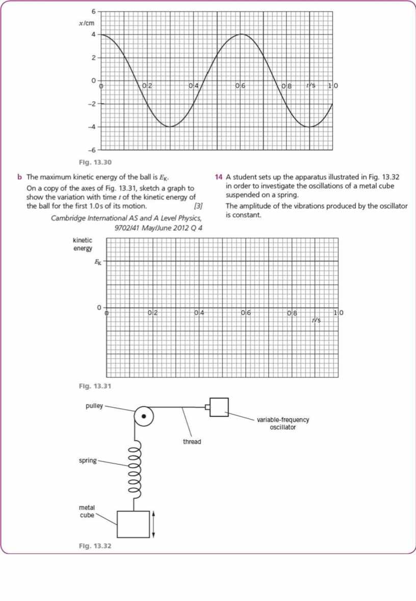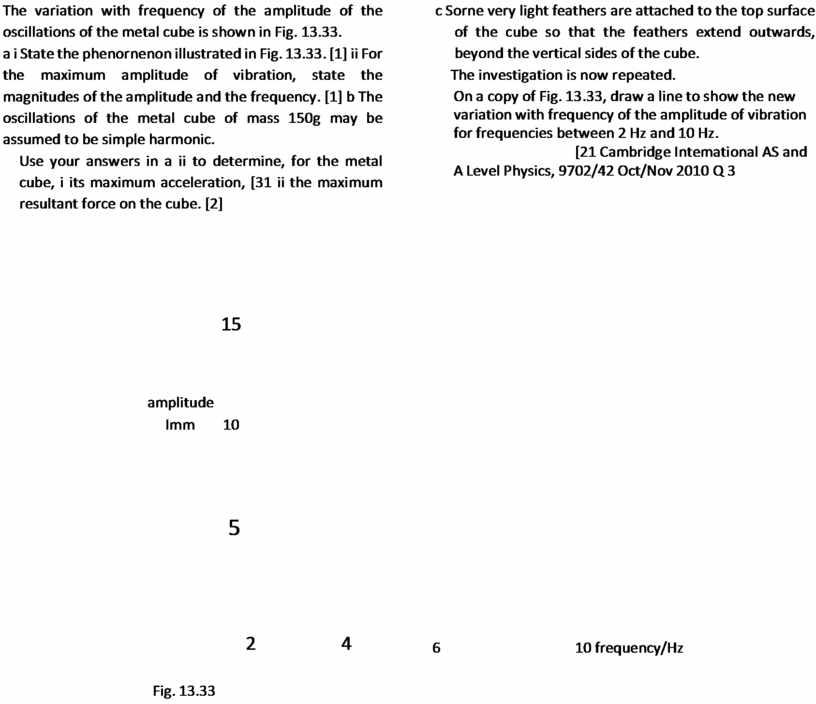 a i State the phenornenon illustrated in Fig. 13.33. [1] ii For the maximum amplitude of vibration, state the magnitudes of the amplitude and the frequency. [1] b The oscillations of the metal cube of mass 150g may be assumed to be simple harmonic.