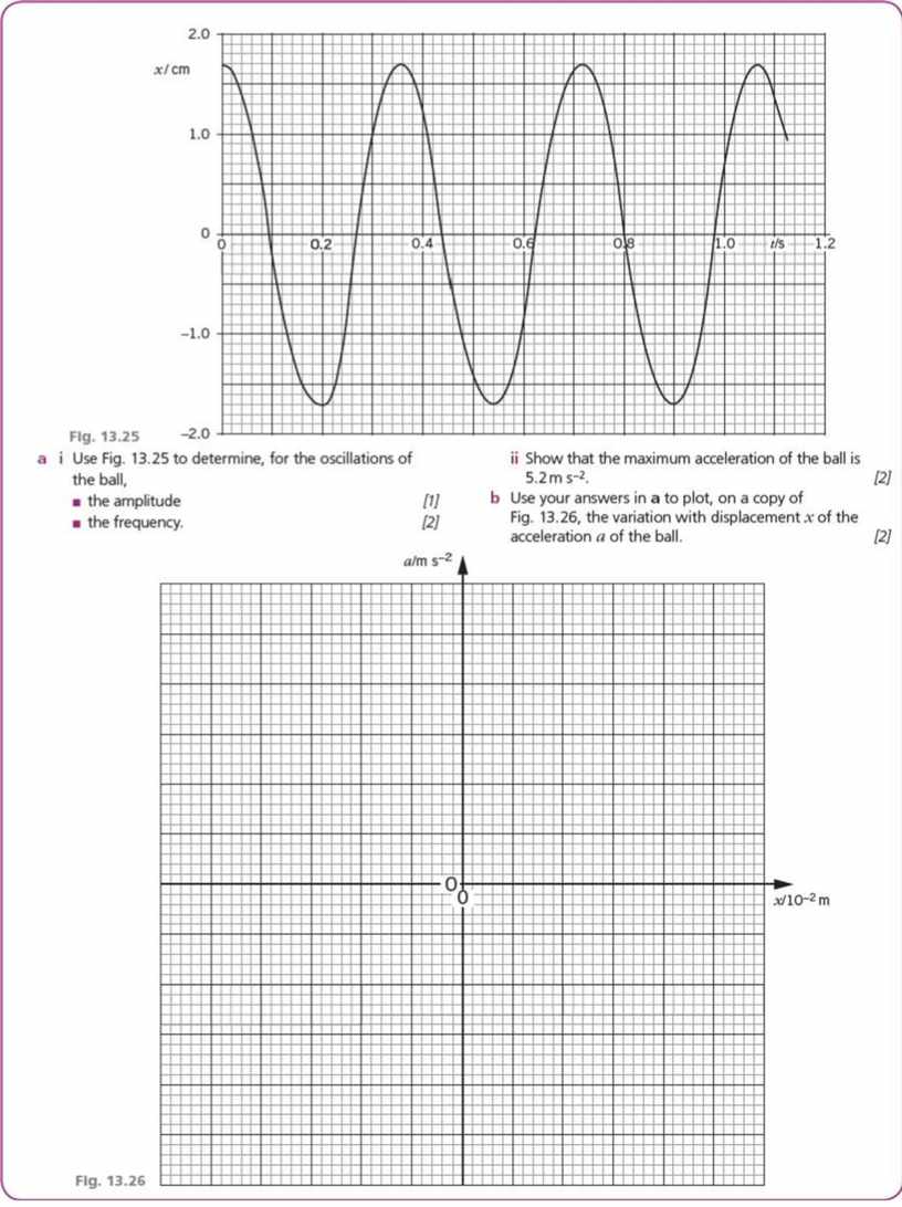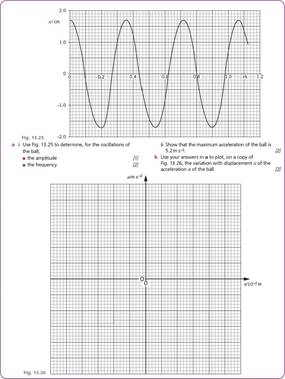 The variation with time t of the displacement x of the ball from its equilibrium position is shown in Fig. 13.25.
