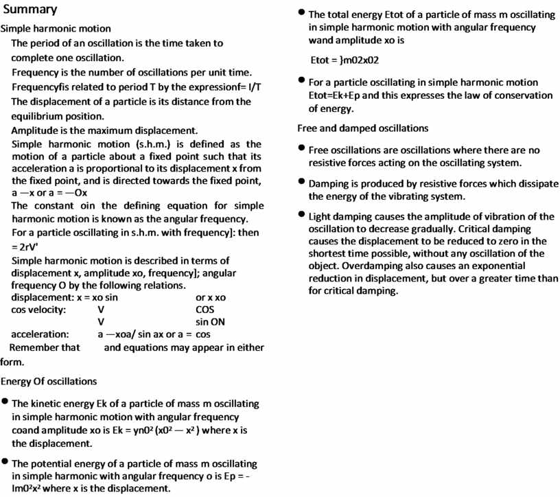 Summary Simple harmonic motion The period of an oscillation is the time taken to complete one oscillation. Frequency is the number of oscillations per unit time. Frequencyfis related to period T by the expressionf= I/T The displacement of a particle is its distance from the equilibrium position. Amplitude is the maximum displacement. Simple harmonic motion (s.h.m.) is defined as the motion of a particle about a fixed point such that its acceleration a is proportional to its displacement x from the fixed point, and is directed towards the fixed point, a —x or a = —Ox The constant oin the defining equation for simple harmonic motion is known as the angular frequency. For a particle oscillating in s.h.m. with frequency]: then = 2rV' Simple harmonic motion is described in terms of displacement x, amplitude xo, frequency]; angular frequency O by the following relations. displacement: x = xo sin or x xo cos velocity: V COS V sin ON acceleration: a —xoa/ sin ax or a = cos Remember that and equations may appear in either form. Energy Of oscillations • The kinetic energy Ek of a particle of mass m oscillating in simple harmonic motion with angular frequency coand amplitude xo is Ek = yn02 (x02 — x2 ) where x is the displacement. • The potential energy of a particle of mass m oscillating in simple harmonic with angular frequency o is Ep = -Im02x2 where x is the displacement. • The total energy Etot of a particle of mass m oscillating in simple harmonic motion with angular frequency wand amplitude xo is Etot = }m02x02 • For a particle oscillating in simple harmonic motion Etot=Ek+Ep and this expresses the law of conservation of energy. Free and damped oscillations • Free oscillations are oscillations where there are no resistive forces acting on the oscillating system. • Damping is produced by resistive forces which dissipate the energy of the vibrating system. • Light damping causes the amplitude of vibration of the oscillation to decrease gradually. Critical damping causes the displacement to be reduced to zero in the shortest time possible, without any oscillation of the object. Overdamping also causes an exponential reduction in displacement, but over a greater time than for critical damping. • The natural frequency of vibration of an object is the frequency at which the object will vibrate when allowed to do so freely. • Forced oscillations occur when a periodic driving force is applied to a system which is capable of vibration. • Resonance occurs when the driving frequency on the system is equal to its natural frequency of vibration. The amplitude of vibration is a maximum at the resonant frequency. |