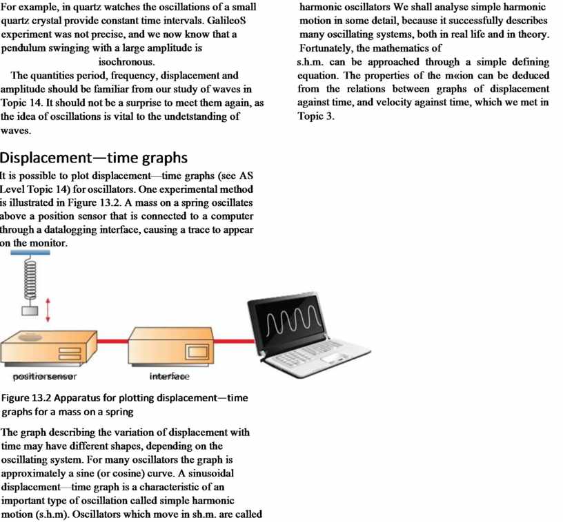 It is possible to plot displacement—time graphs (see AS Level Topic 14) for oscillators. One experimental method is illustrated in Figure 13.2. A mass on a spring oscillates above a position sensor that is connected to a computer through a datalogging interface, causing a trace to appear on the monitor.