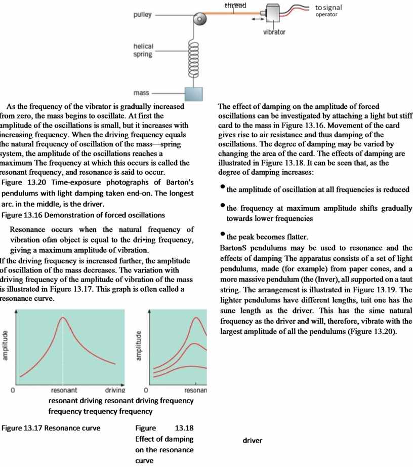 7 The apparatus of fig. 13.16 is used to demonstrate forced vibrations and resonance. A 50 g mass is suspended from the spring, which has a spring constant of 7.9N m-l . a Calculate the resonant frequencyfo of the system.