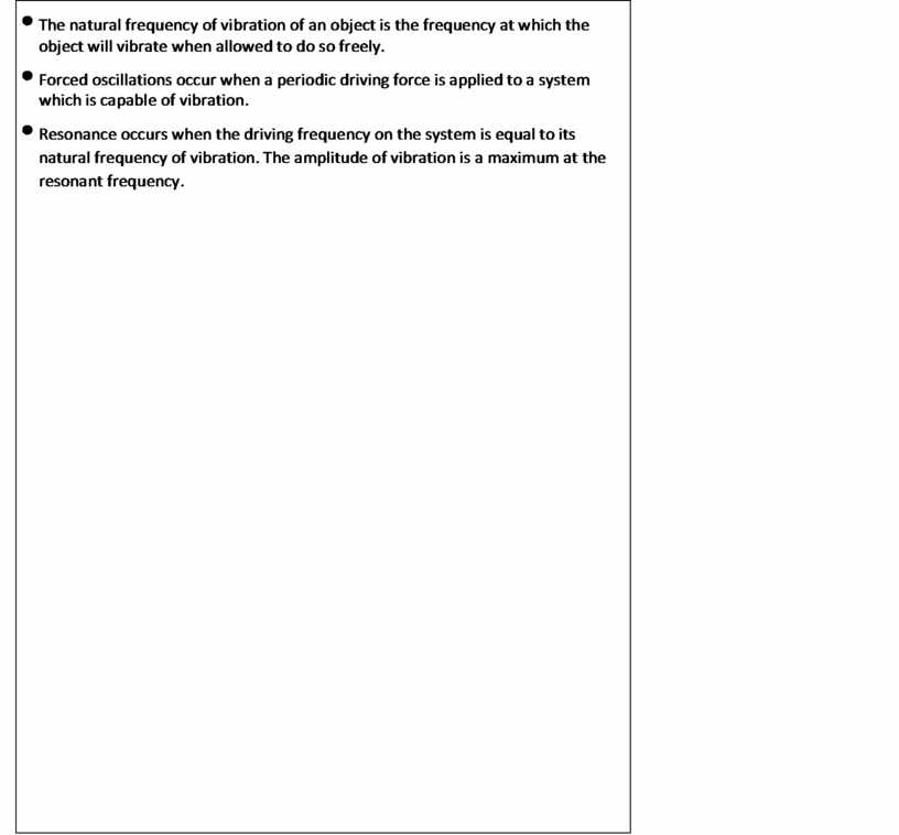 Resonance occurs when the natural frequency of vibration ofan object is equal to the dri•ing frequency, giving a maximum amplitude of vibration.