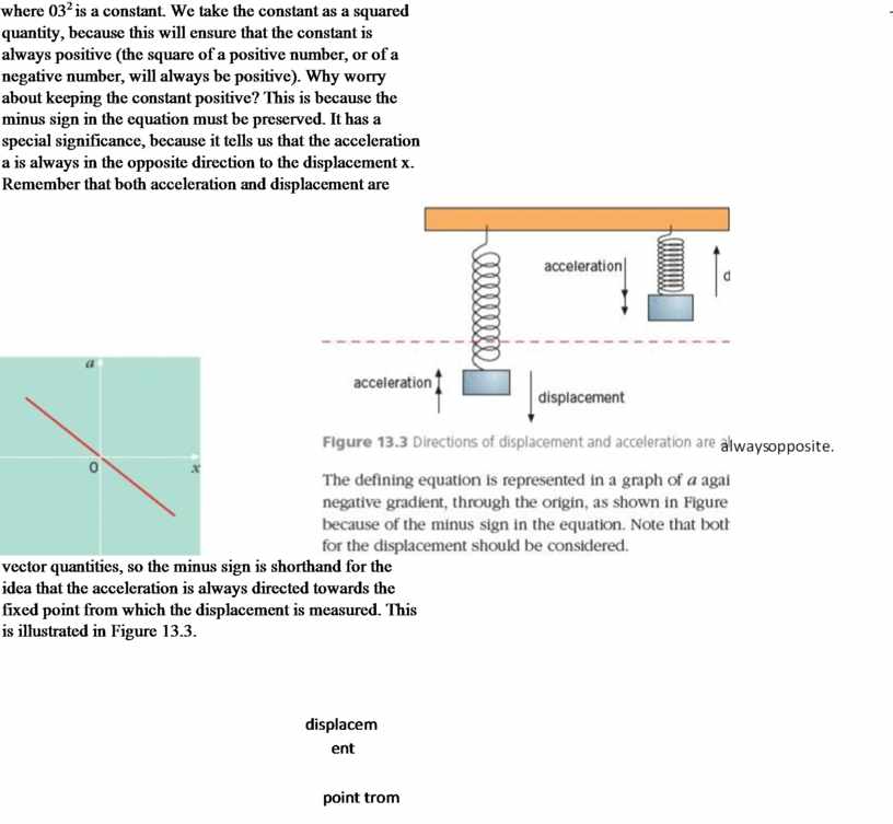 The defining equation is represented in a graph of a against x as a straight line, of negative gradient, through the origin, as shown in Figure 134. The gradient is negative because of the minus sign in the equation. Note that both positive and negative values for the displacement should be considered.