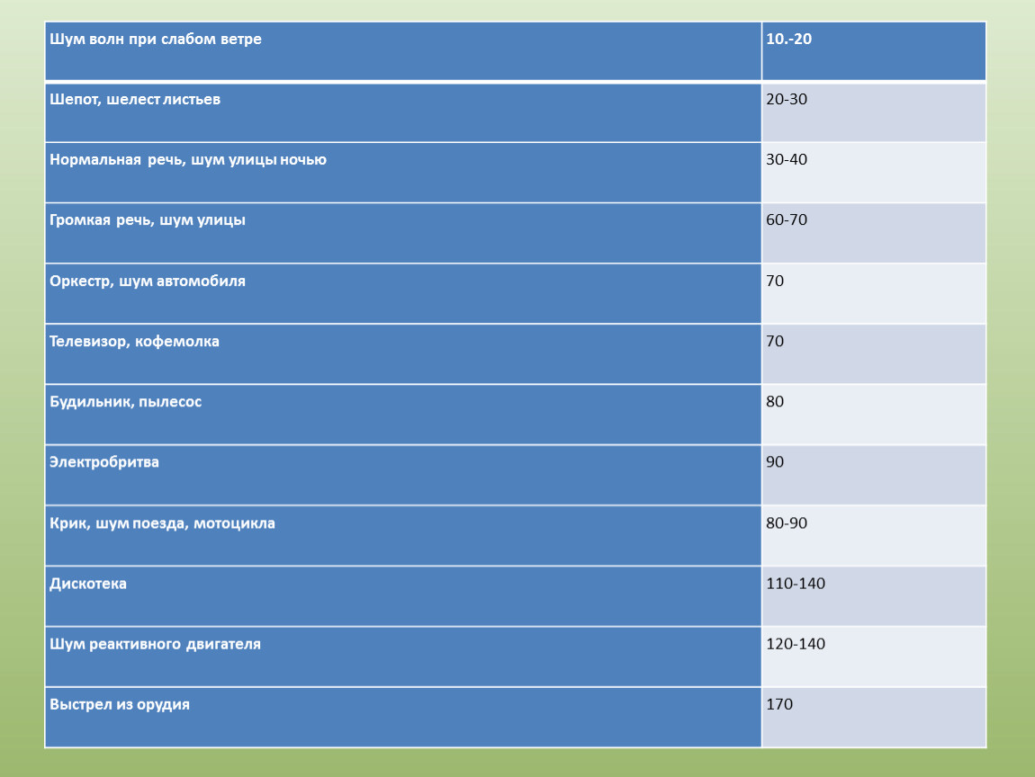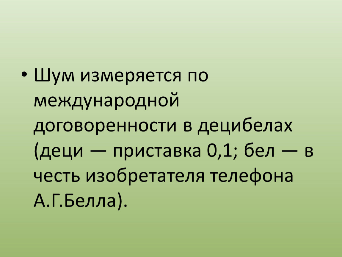 Шум измеряется по международной договоренности в децибелах (деци — приставка 0,1; бел — в честь изобретателя телефона А.Г.Белла).