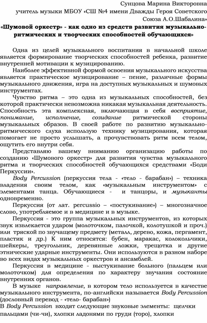 Представляю вашему вниманию организацию работы по созданию «Шумового оркестр» для развития чувства музыкального ритма и творческих способностей обучающихся средствами «Боди Перкуссии».