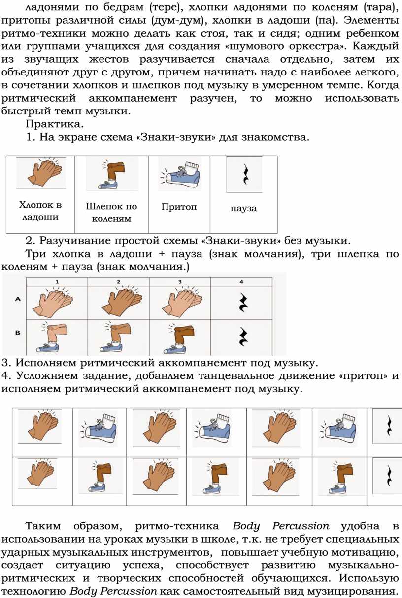 Таким образом, ритмо-техника Body Percussion удобна в использовании на уроках музыки в школе, т.к. не требует специальных ударных музыкальных инструментов, повышает учебную мотивацию, создает ситуацию успеха, способствует развитию музыкально-ритмических и творческих способностей обучающихся. Использую технологию Body Percussion как самостоятельный вид музицирования. Рекомендую использовать на уроках по другим предметам в качестве физкультминутки.