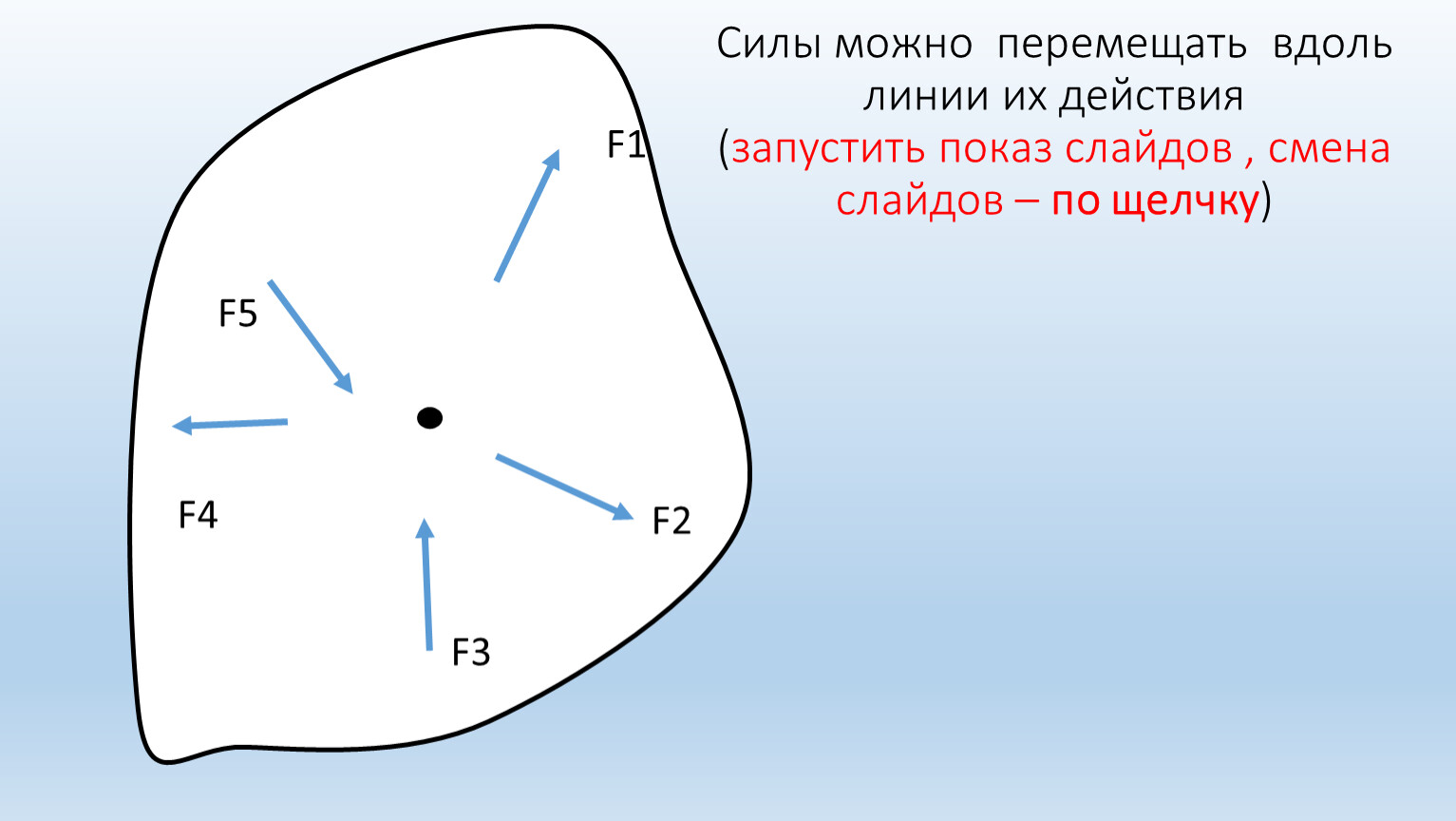 Силы можно перемещать вдоль линии их действия (запустить показ слайдов , смена слайдов – по щелчку)