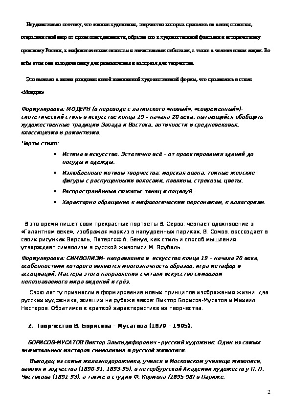 Цель урока: раскрыть содержание понятия стиля «модерн» в приложении к русской живописи этого периода; показать как проявился стиль «модерн» в творчестве В. Борисова – Мусатова и М. Нестерова;