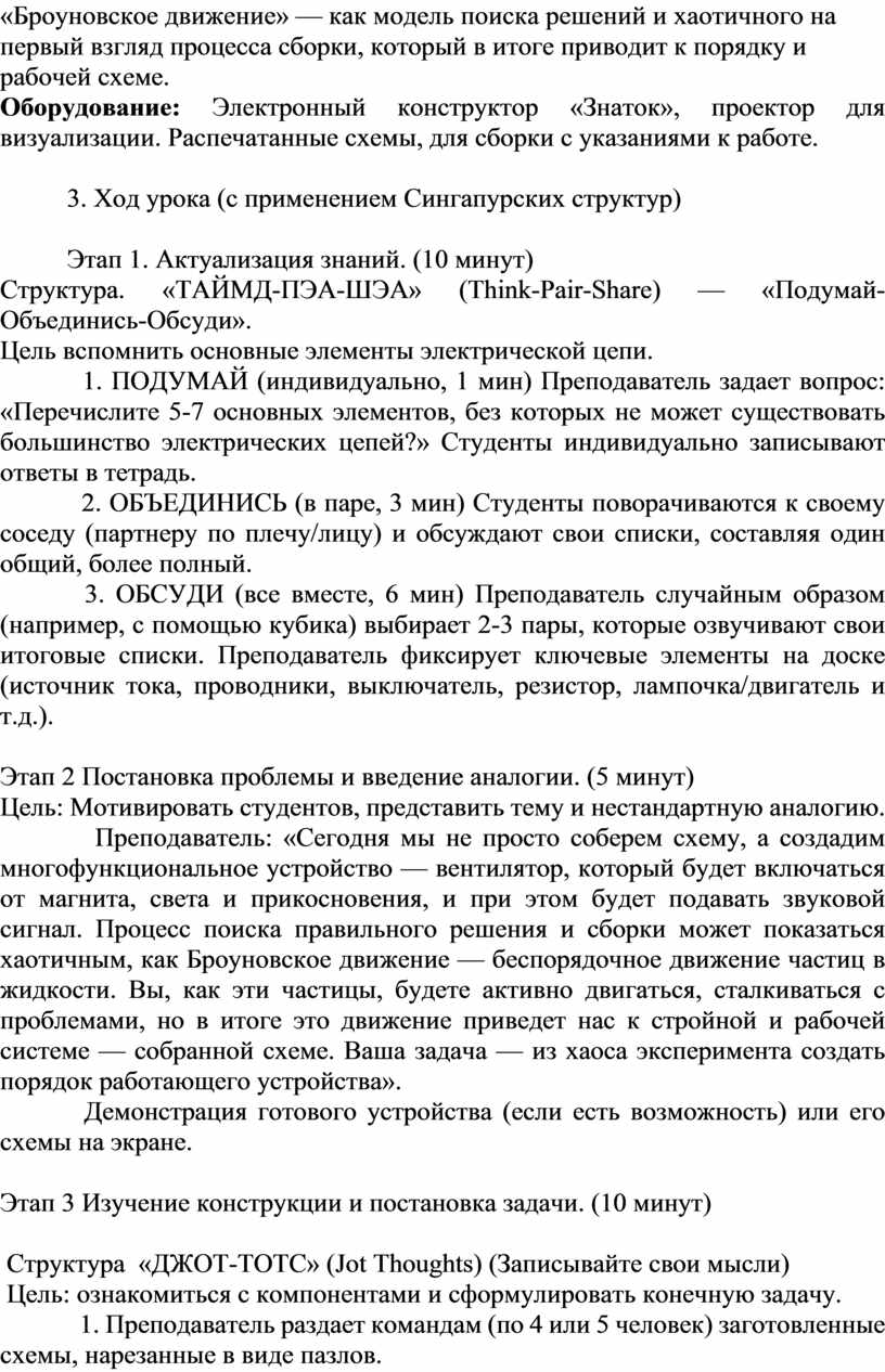 Самоконтроль обучающихся – ответы на вопросы преподавателя, качество выполнения практического задания. Применение Сингапурской системы. «Броуновское движение» — как модель поиска решений и хаотичного на первый взгляд процесса сборки, который в итоге приводит к порядку и рабочей схеме.