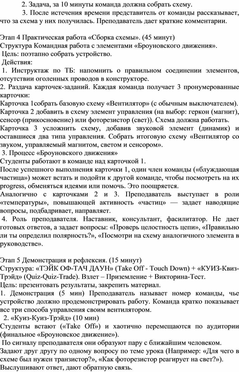Преподаватель: «Сегодня мы не просто соберем схему, а создадим многофункциональное устройство — вентилятор, который будет включаться от магнита, света и прикосновения, и при этом будет подавать звуковой сигнал. Процесс поиска правильного решения и сборки может показаться хаотичным, как Броуновское движение — беспорядочное движение частиц в жидкости. Вы, как эти частицы, будете активно двигаться, сталкиваться с проблемами, но в итоге это движение приведет нас к стройной и рабочей системе — собранной схеме. Ваша задача — из хаоса эксперимента создать порядок работающего устройства».