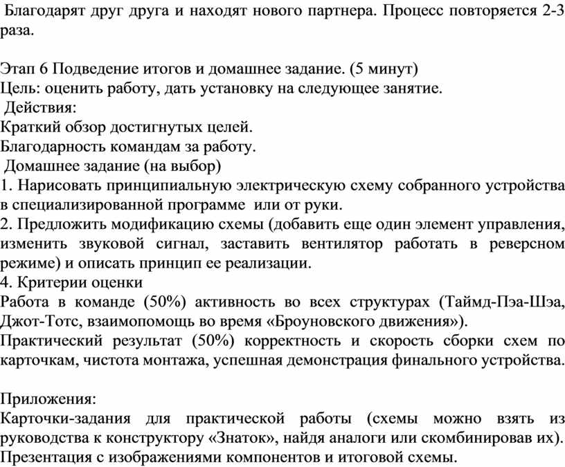 Практический результат (50%) корректность и скорость сборки схем по карточкам, чистота монтажа, успешная демонстрация финального устройства.