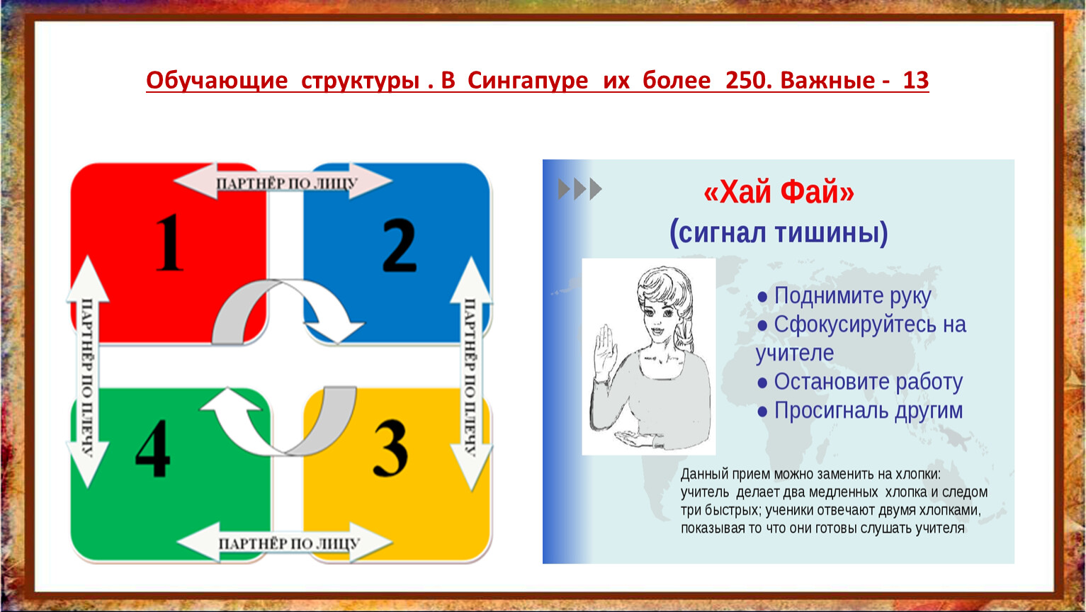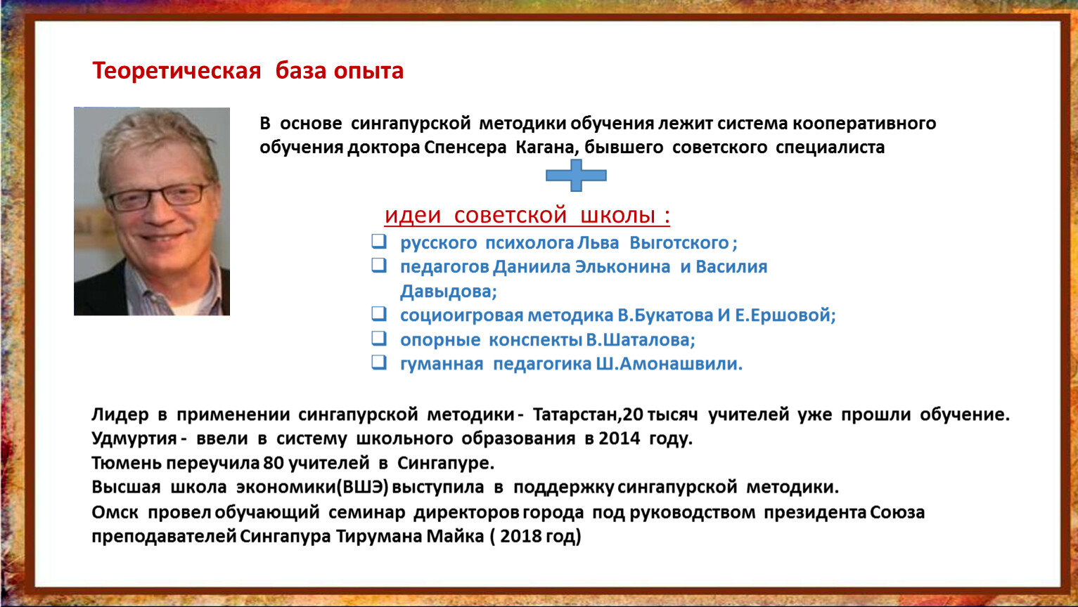 В основе сингапурской методики обучения лежит система кооперативного обучения доктора Спенсера Кагана, бывшего советского специалиста