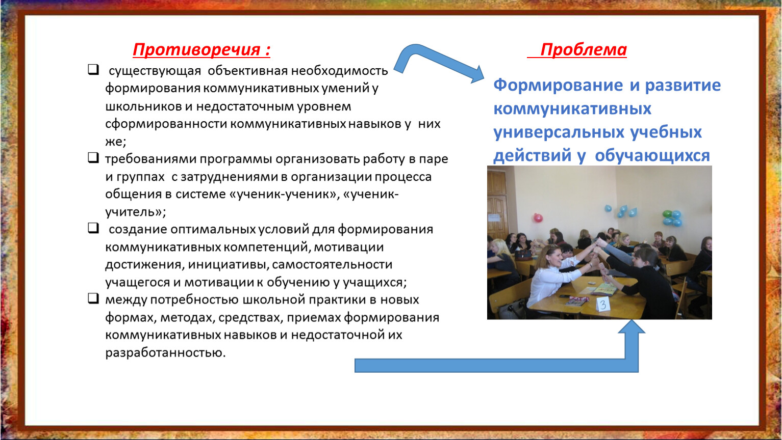 между потребностью школьной практики в новых формах, методах, средствах, приемах формирования коммуникативных навыков и недостаточной их разработанностью.