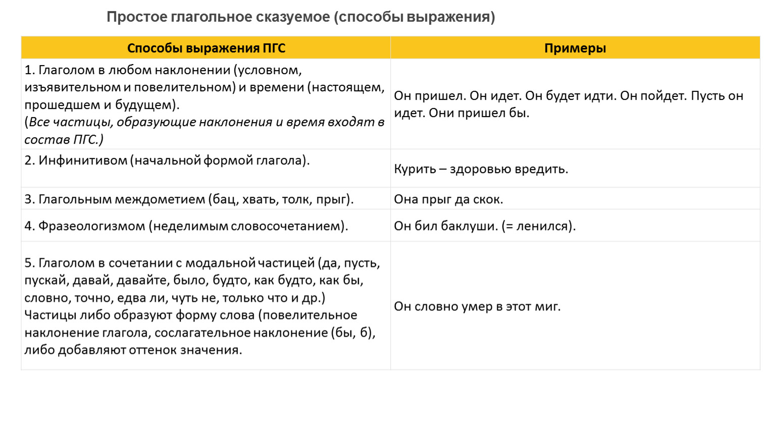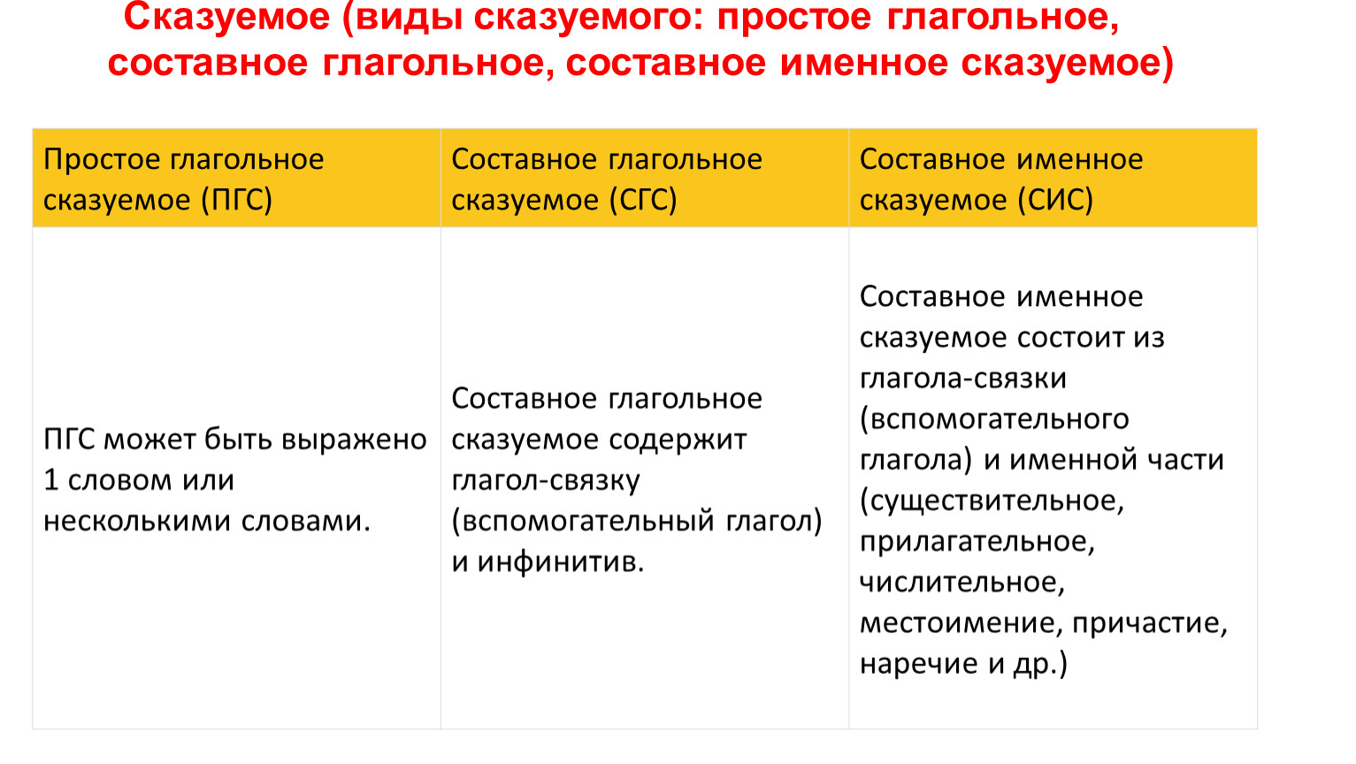 Простое глагольное сказуемое (ПГС) | Составное глагольное сказуемое (СГС) | Составное именное сказуемое (СИС) |