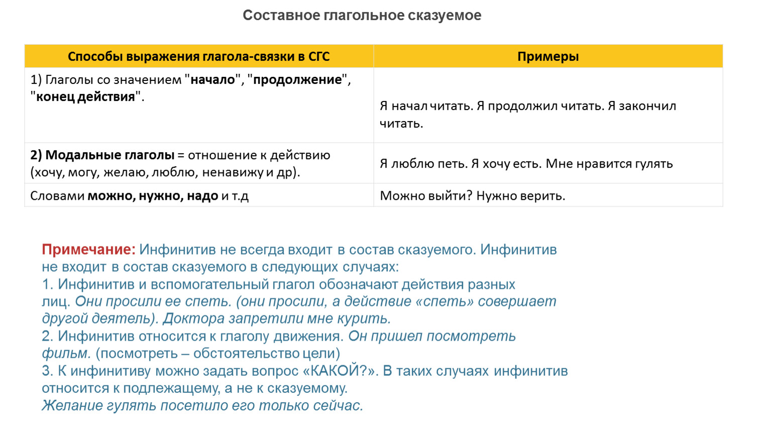 Примечание: Инфинитив не всегда входит в состав сказуемого. Инфинитив не входит в состав сказуемого в следующих случаях:1. Инфинитив и вспомогательный глагол обозначают действия разных лиц. Они просили ее спеть. (они просили, а действие «спеть» совершает другой деятель). Доктора запретили мне курить. 2. Инфинитив относится к глаголу движения. Он пришел посмотреть фильм. (посмотреть – обстоятельство цели) 3. К инфинитиву можно задать вопрос «КАКОЙ?». В таких случаях инфинитив относится к подлежащему, а не к сказуемому. Желание гулять посетило его только сейчас.