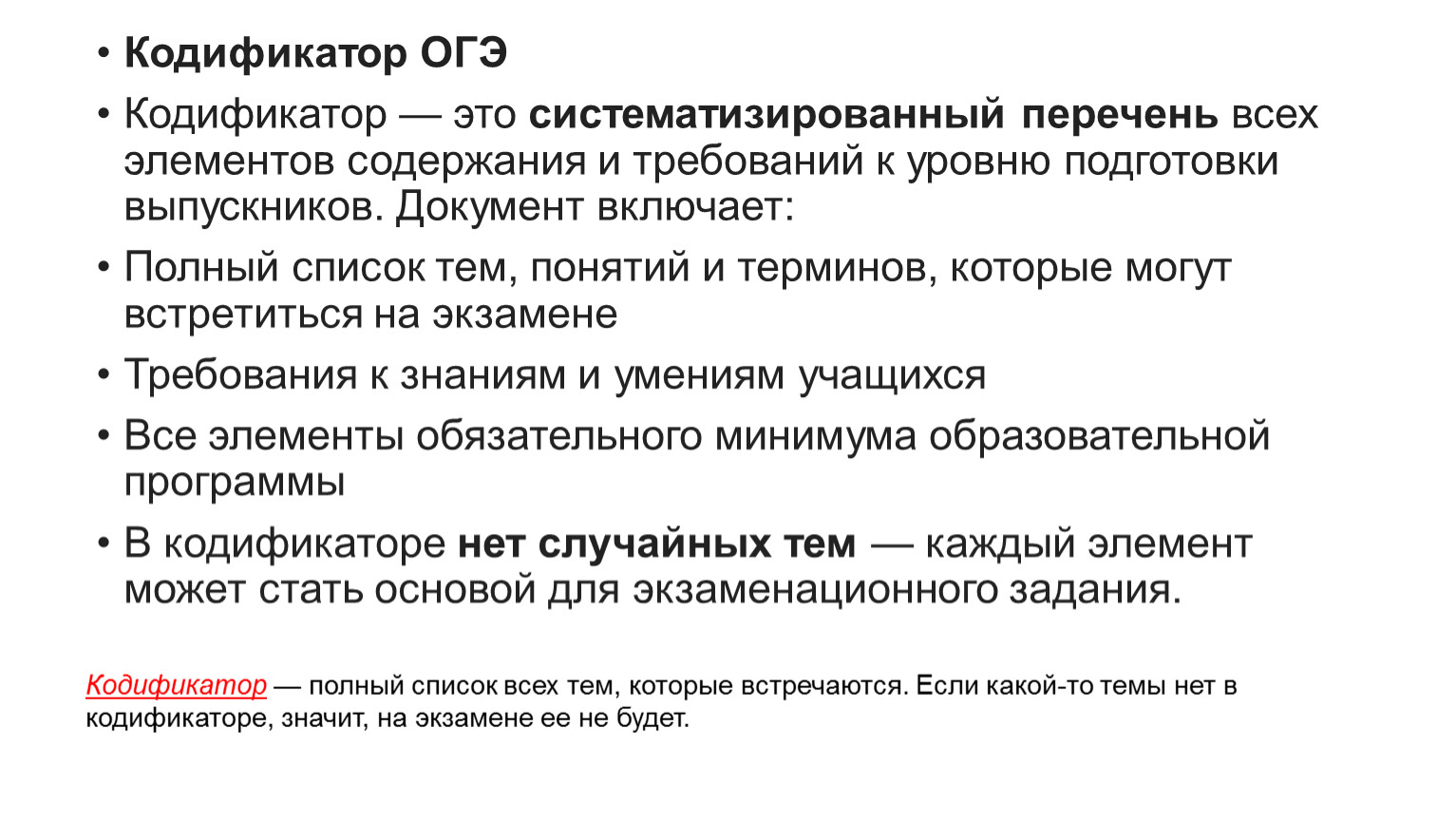 Кодификатор — полный список всех тем, которые встречаются. Если какой-то темы нет в кодификаторе, значит, на экзамене ее не будет.