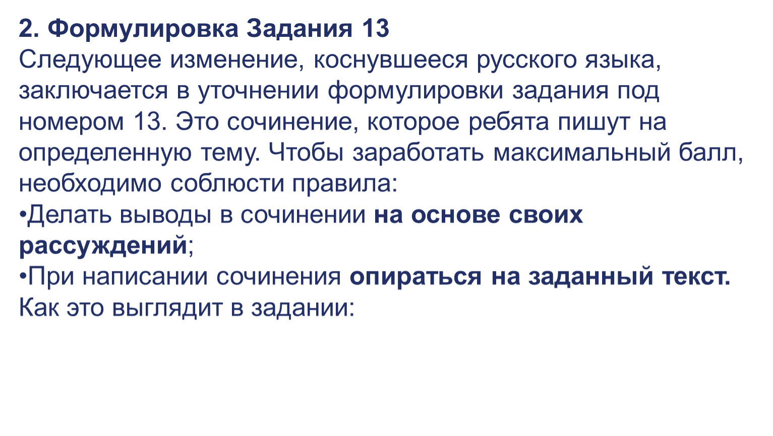 Следующее изменение, коснувшееся русского языка, заключается в уточнении формулировки задания под номером 13. Это сочинение, которое ребята пишут на определенную тему. Чтобы заработать максимальный балл, необходимо соблюсти правила: