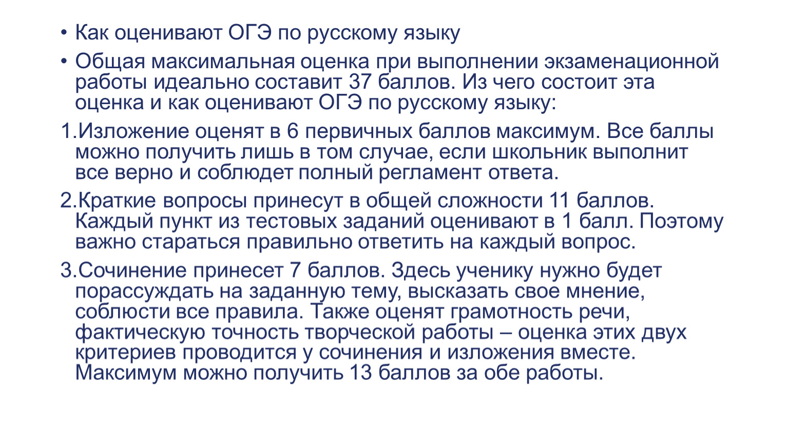 Общая максимальная оценка при выполнении экзаменационной работы идеально составит 37 баллов. Из чего состоит эта оценка и как оценивают ОГЭ по русскому языку: