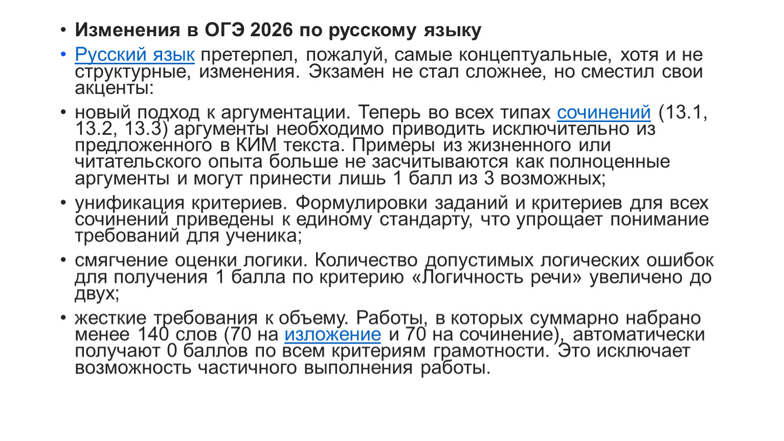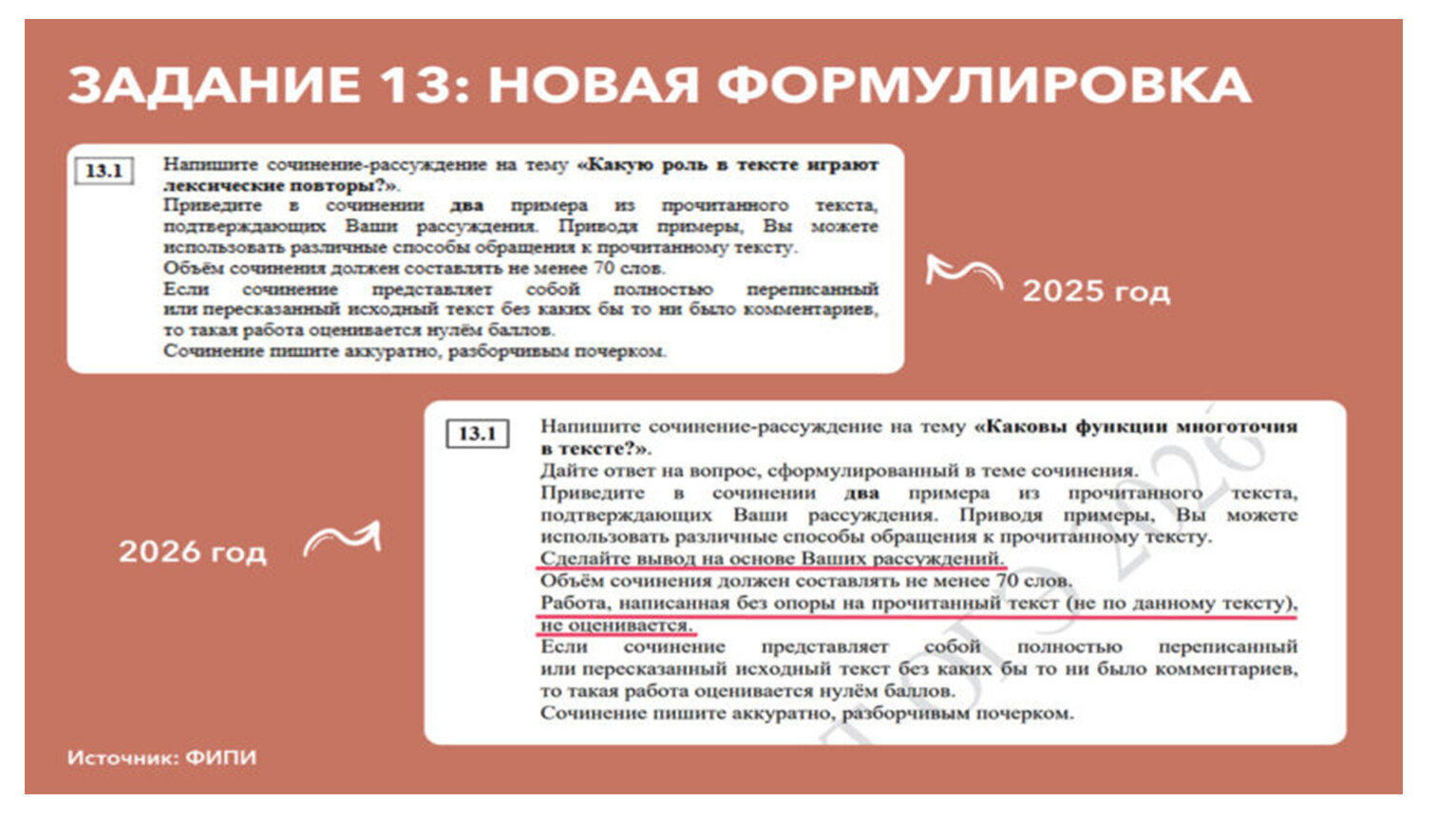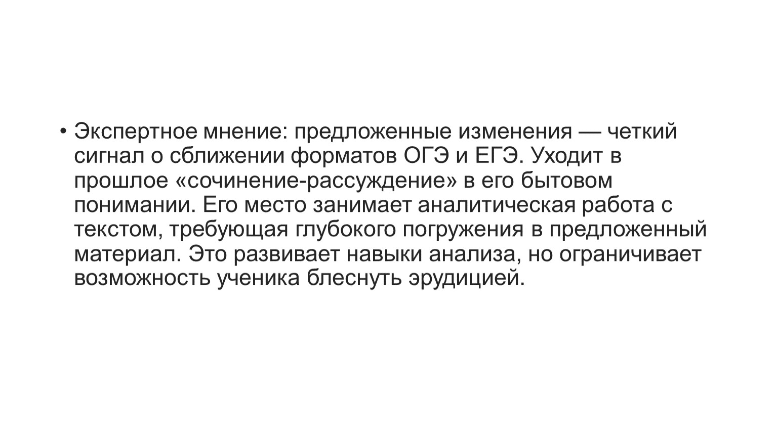 Экспертное мнение: предложенные изменения — четкий сигнал о сближении форматов ОГЭ и ЕГЭ. Уходит в прошлое «сочинение-рассуждение» в его бытовом понимании. Его место занимает аналитическая работа с текстом, требующая глубокого погружения в предложенный материал. Это развивает навыки анализа, но ограничивает возможность ученика блеснуть эрудицией.