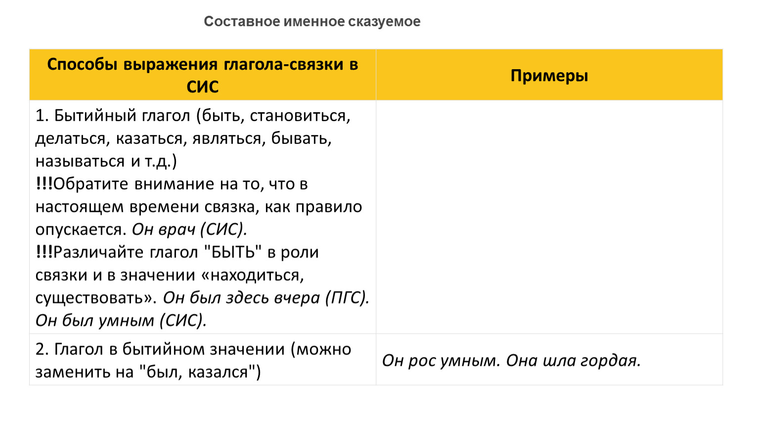 1. Бытийный глагол (быть, становиться, делаться, казаться, являться, бывать, называться и т.д.) !!!Обратите внимание на то, что в настоящем времени связка, как правило опускается. Он врач (СИС). !!!Различайте глагол "БЫТЬ" в роли связки и в значении «находиться, существовать». Он был здесь вчера (ПГС). Он был умным (СИС). | |