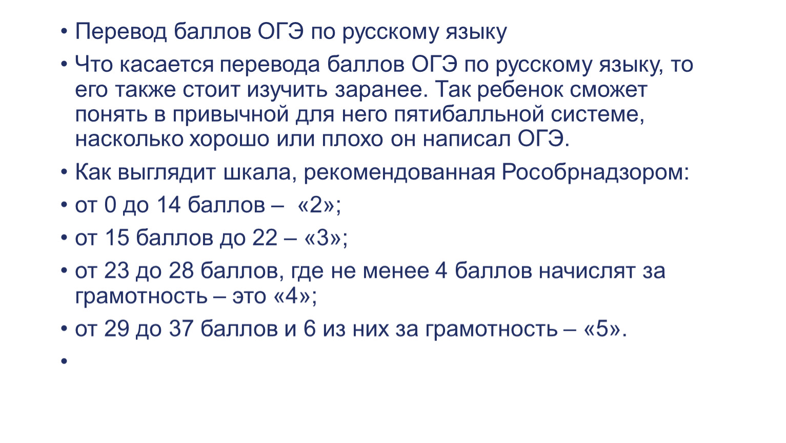 Что касается перевода баллов ОГЭ по русскому языку, то его также стоит изучить заранее. Так ребенок сможет понять в привычной для него пятибалльной системе, насколько хорошо или плохо он написал ОГЭ.