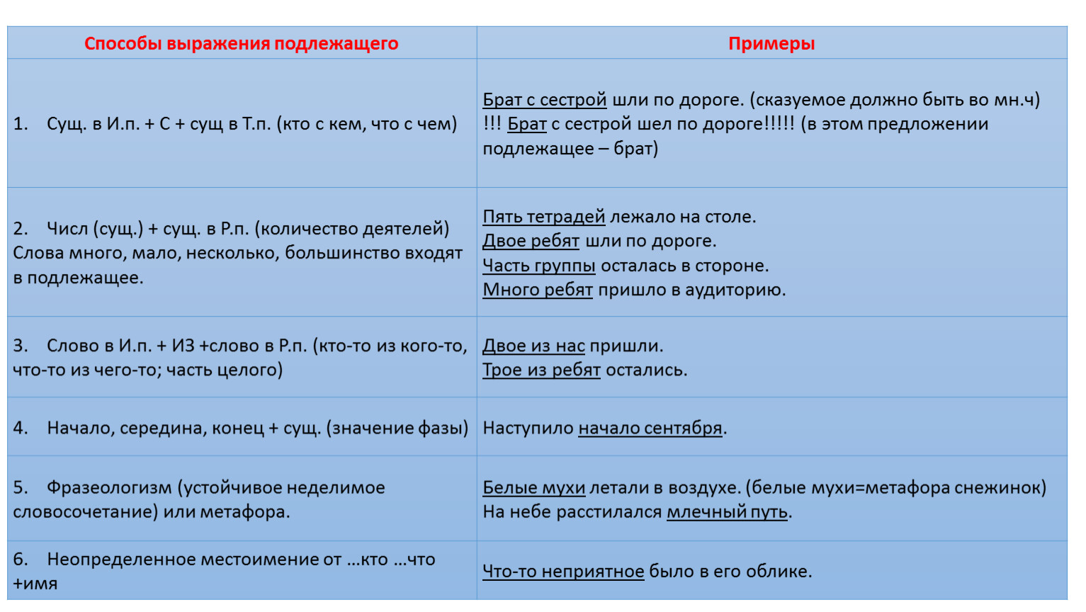 1. Сущ. в И.п. + С + сущ в Т.п. (кто с кем, что с чем) | Брат с сестрой шли по дороге. (сказуемое должно быть во мн.ч) !!! Брат с сестрой шел по дороге!!!!! (в этом предложении подлежащее – брат) |