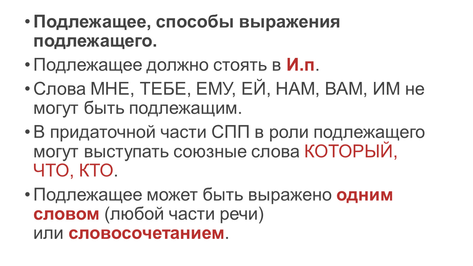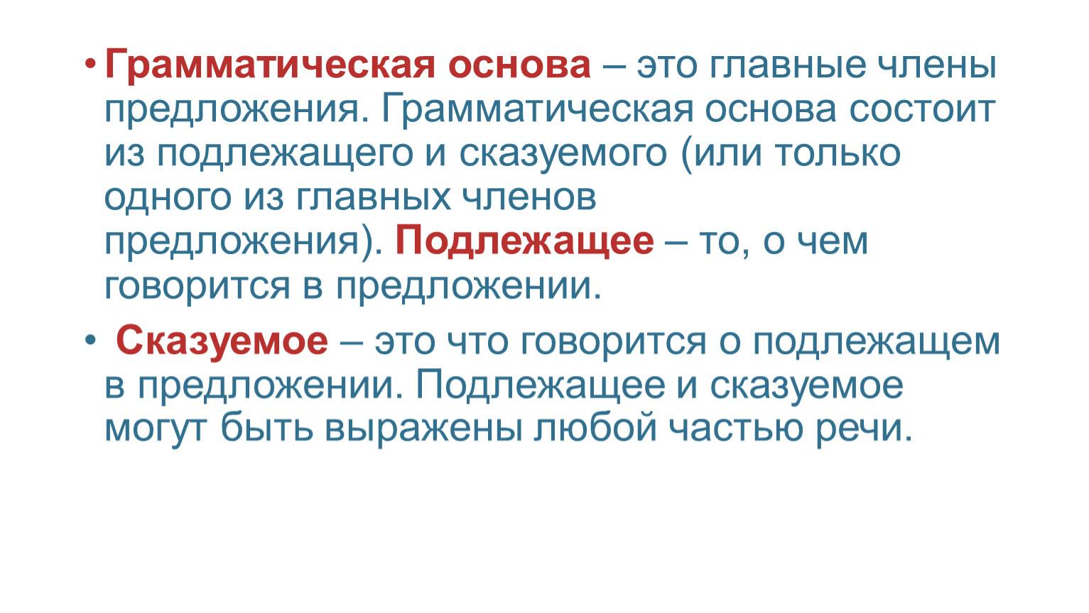 Грамматическая основа – это главные члены предложения. Грамматическая основа состоит из подлежащего и сказуемого (или только одного из главных членов предложения). Подлежащее – то, о чем говорится в предложении.