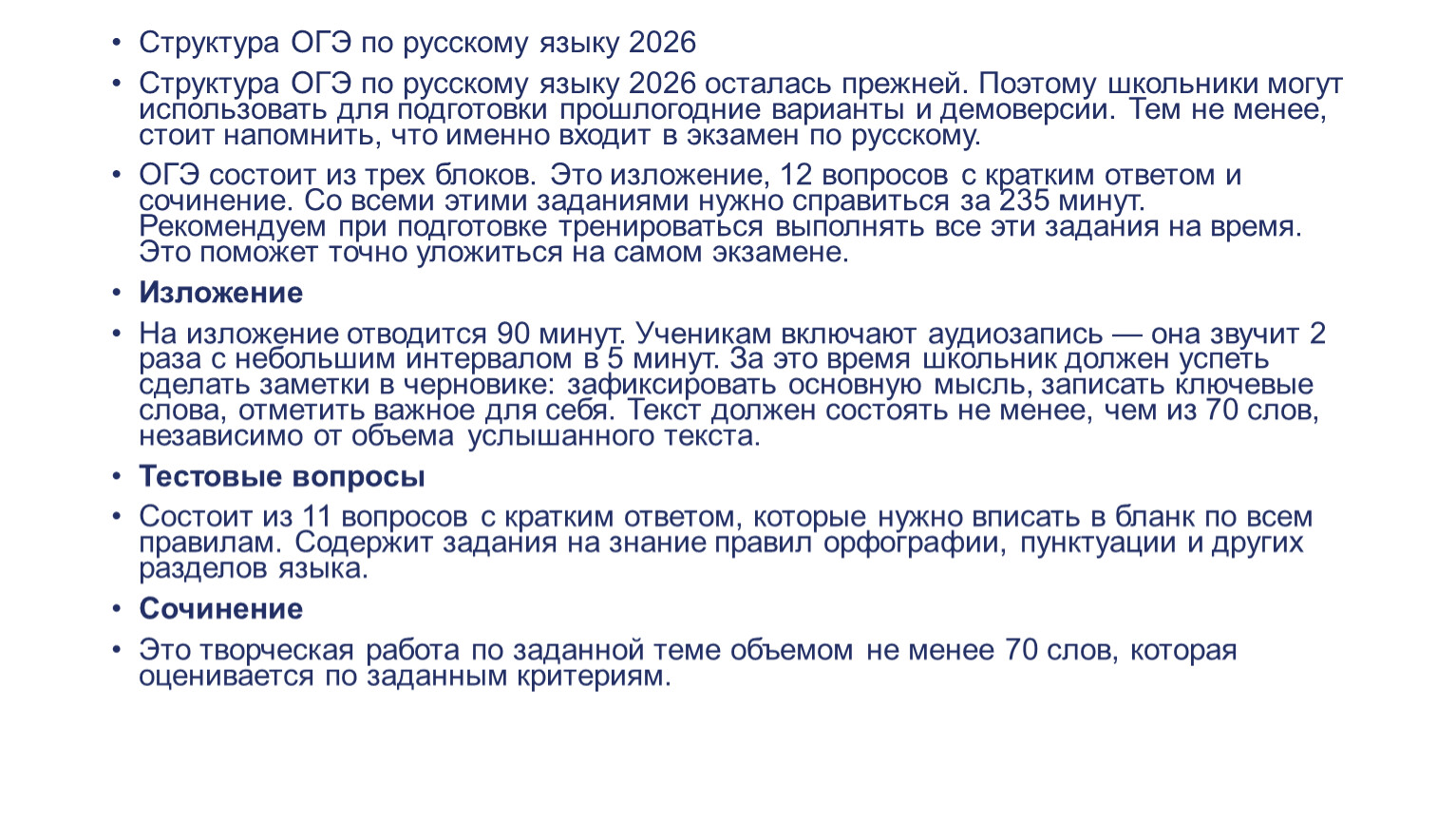 Структура ОГЭ по русскому языку 2026 осталась прежней. Поэтому школьники могут использовать для подготовки прошлогодние варианты и демоверсии. Тем не менее, стоит напомнить, что именно входит в экзамен по русскому.