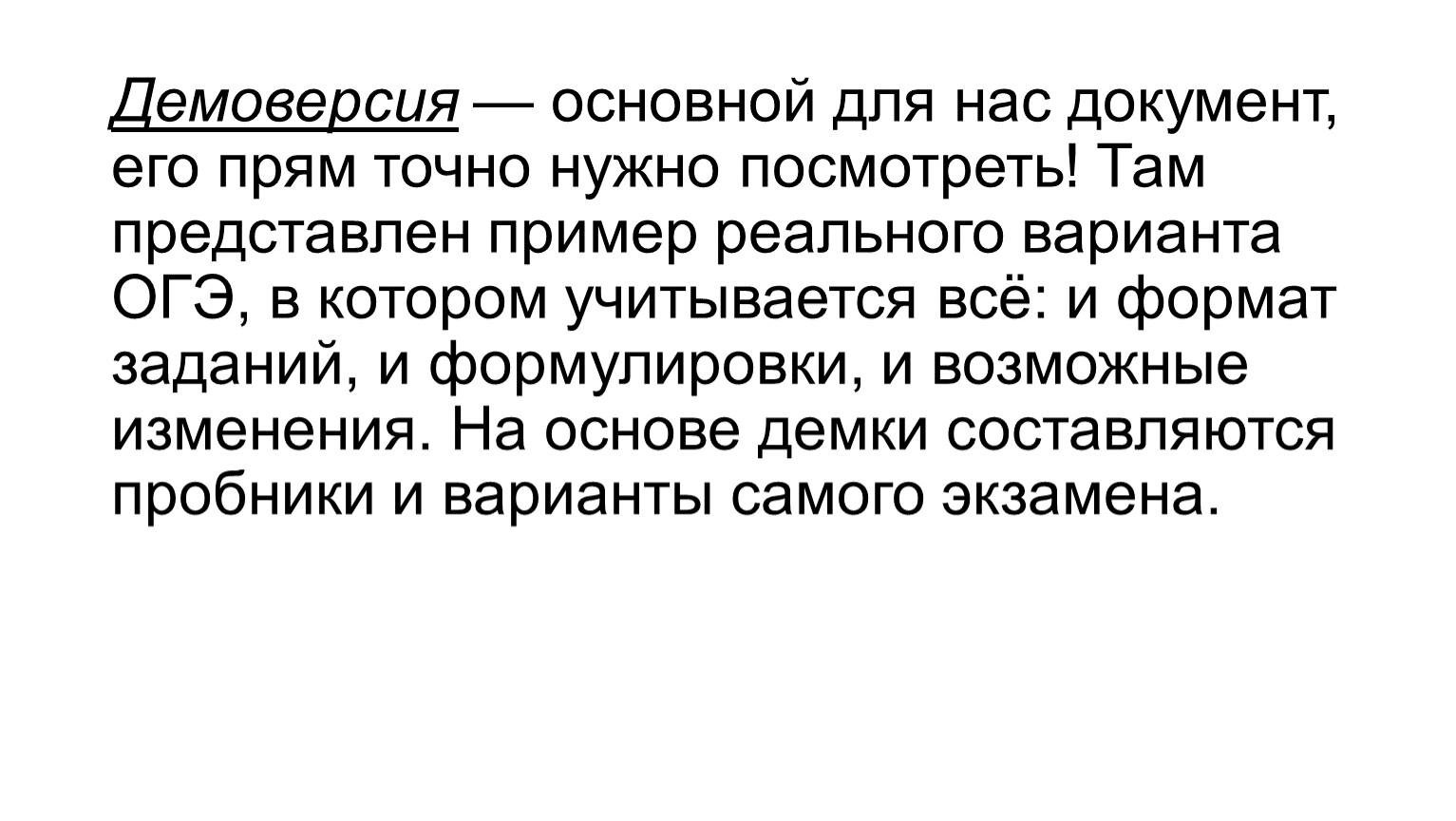 Демоверсия — основной для нас документ, его прям точно нужно посмотреть! Там представлен пример реального варианта ОГЭ, в котором учитывается всё: и формат заданий, и формулировки, и возможные изменения. На основе демки составляются пробники и варианты самого экзамена.