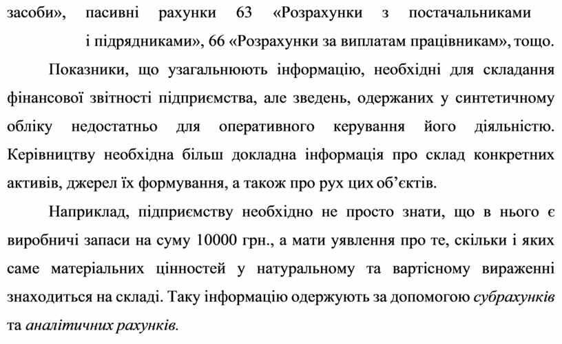 Наприклад, підприємству необхідно не просто знати, що в нього є виробничі запаси на суму 10000 грн., а мати уявлення про те, скільки і яких саме матеріальних цінностей у натуральному та вартісному вираженні знаходиться на складі. Таку інформацію одержують за допомогою субрахунків та аналітичних рахунків.