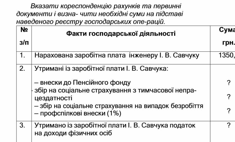Утримані із заробітної плати І. В. Савчука: – внески до Пенсійного фонду – збір на соціальне страхування з тимчасової непра- цездатності – збір на соціальне страхування на випадок безробіття – профспілкові внески (1%) |