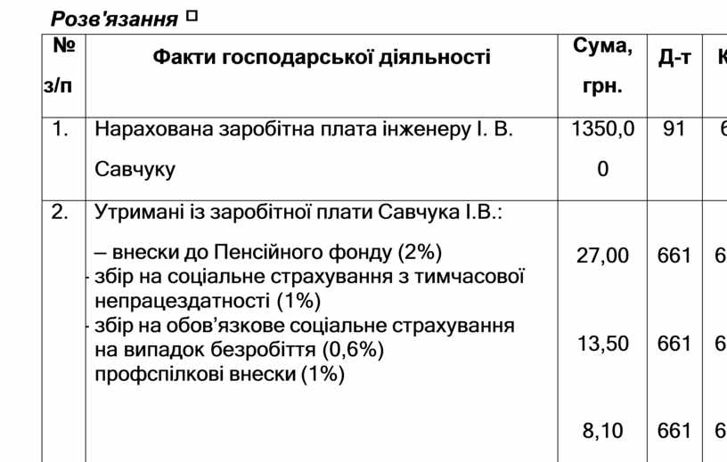 Утримані із заробітної плати Савчука І.В.: – внески до Пенсійного фонду (2%) – збір на соціальне страхування з тимчасової непрацездатності (1%) – збір на обов’язкове соціальне страхування на випадок безробіття (0,6%) профспілкові внески (1%) |