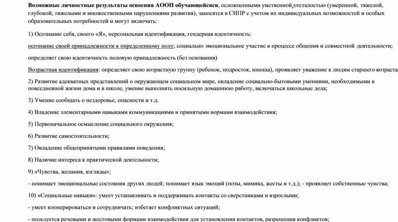 Возможные личностные результаты освоения АООП обучающейсяся, осложненными умственной отсталостью (умеренной, тяжелой, глубокой, тяжелыми и множественными нарушениями развития), заносятся в СИПР с учетом их индивидуальных возможностей и особых образовательных потребностей и могут включать:
