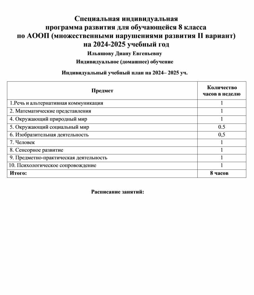 Индивидуальный учебный план составлен с учетом психофизического состояния Дианы. С согласия родителей в учебный план внесены занятия из коррекционно-развивающих областей. Темы уроков-занятий какой-либо области находят свое логическое продолжение в темах уроков-занятий других областей.