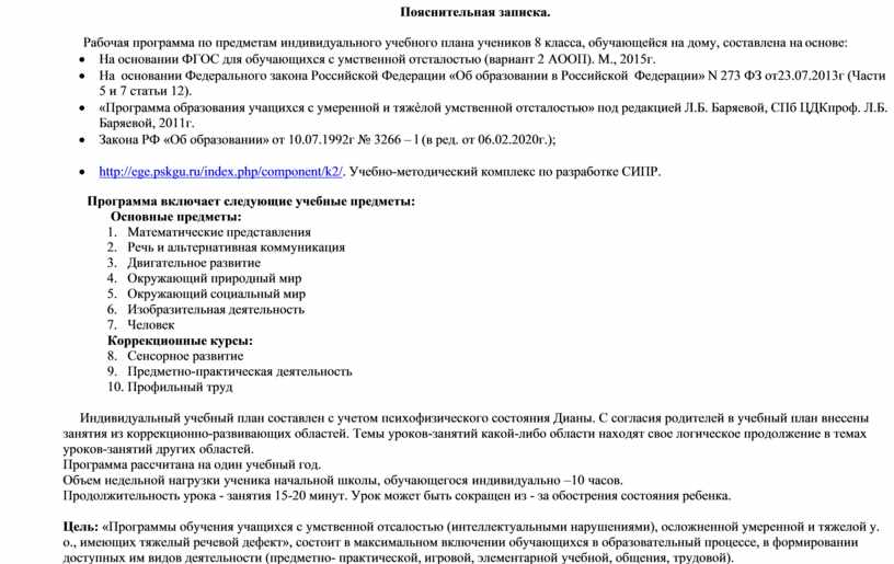 Рабочая программа по предметам индивидуального учебного плана учеников 8 класса, обучающейся на дому, составлена на основе: