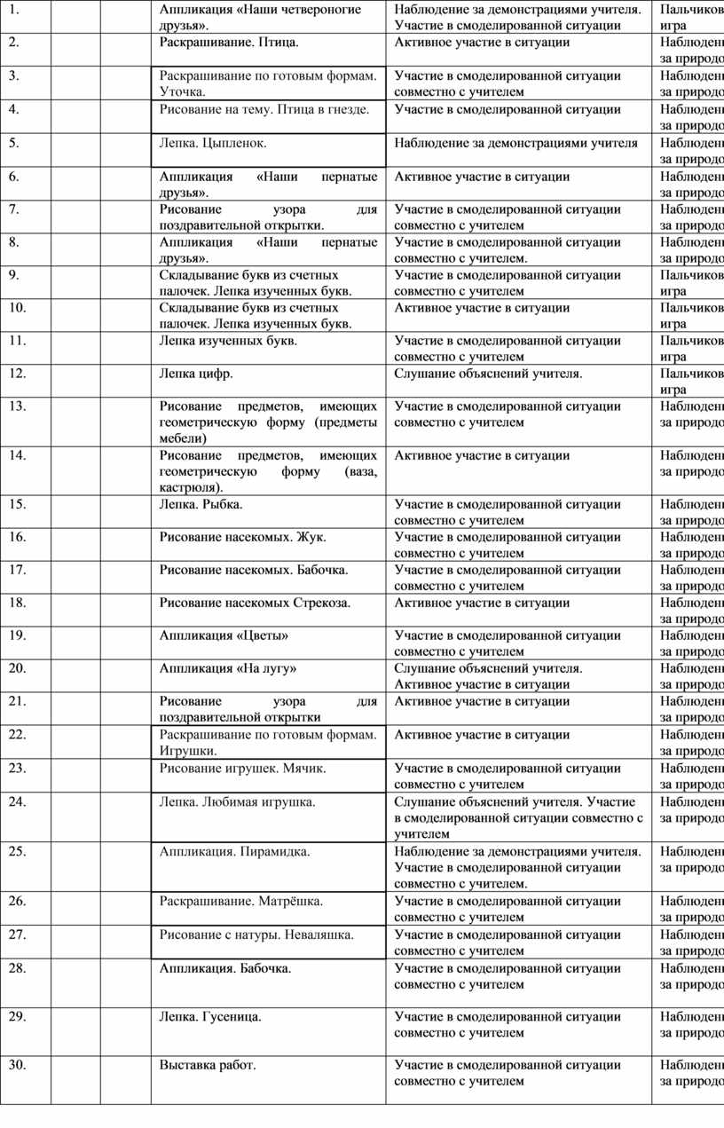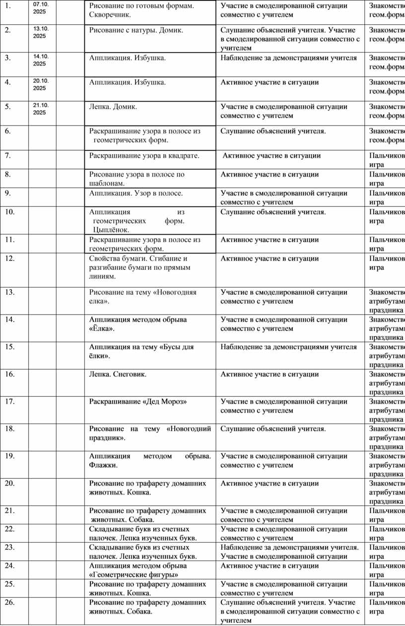Рисование точек. Рисование вертикальных (горизонтальных, наклонных) линий. Соединение точек. Рисование геометрической фигуры (круг, овал, квадрат, прямоугольник, треугольник). Закрашивание внутри контура (заполнение всей поверхности внутри контура). Заполнение контура точками. Штриховка слева направо (сверху вниз, по диагонали), двойная штриховка. Рисование контура предмета по контурным линиям (по опорным точкам, по трафарету, по шаблону, по представлению). Дорисовывание части (отдельных деталей, симметричной половины) предмета. Рисование предмета (объекта) с натуры. Рисование растительных (геометрических) элементов орнамента. Дополнение готового орнамента растительными (геометрическими) элементами. Рисование орнамента из растительных и геометрических форм в полосе (в круге, в квадрате). Дополнение сюжетного рисунка отдельными предметами (объектами), связанными между собой по смыслу. Расположение объектов на поверхности листа при рисовании сюжетного рисунка. Рисование приближенного и удаленного объекта. Подбор цвета в соответствии с сюжетом рисунка. Рисование сюжетного рисунка по образцу (срисовывание готового сюжетного рисунка) из предложенных объектов (по представлению). Рисование с использованием нетрадиционных техник: монотипии, «по - сырому», рисования с солью, рисования шариками, граттаж, «под батик».