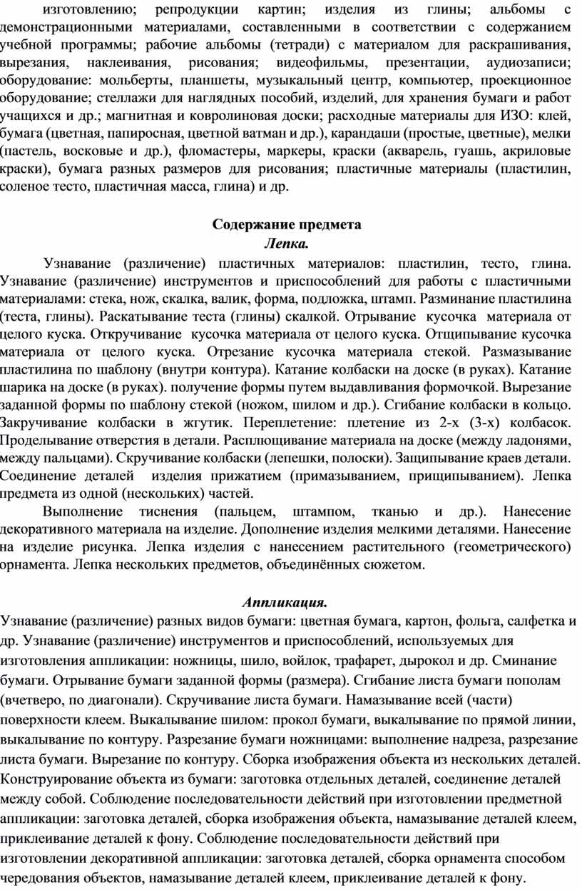 Материально-техническое оснащение учебного предмета «Изобразительная деятельность» предусматривает: наборы инструментов для занятий изобразительной деятельностью, включающие кисти, ножницы (специализированные, для фигурного вырезания, для левой руки и др.), шило, коврики, фигурные перфораторы, стеки, индивидуальные доски, пластиковые подложки и т.д.; натуральные объекты, изображения (картинки, фотографии, пиктограммы) готовых изделий и операций по их изготовлению; репродукции картин; изделия из глины; альбомы с демонстрационными материалами, составленными в соответствии с содержанием учебной программы; рабочие альбомы (тетради) с материалом для раскрашивания, вырезания, наклеивания, рисования; видеофильмы, презентации, аудиозаписи; оборудование: мольберты, планшеты, музыкальный центр, компьютер, проекционное оборудование; стеллажи для наглядных пособий, изделий, для хранения бумаги и работ учащихся и др.; магнитная и ковролиновая доски; расходные материалы для ИЗО: клей, бумага (цветная, папиросная, цветной ватман и др.), карандаши (простые, цветные), мелки (пастель, восковые и др.), фломастеры, маркеры, краски (акварель, гуашь, акриловые краски), бумага разных размеров для рисования; пластичные материалы (пластилин, соленое тесто, пластичная масса, глина) и др.
