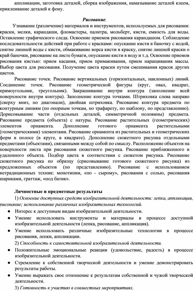 Программа по изобразительной деятельности включает три раздела: «Лепка», «Рисование», «Аппликация». Во время занятий изобразительной деятельностью необходимо вызывать у ребенка положительную эмоциональную реакцию, поддерживать и стимулировать его творческие устремления, развивать самостоятельность. Ребенок обучается уважительному отношению к своим работам, оформляя их в рамы, участвуя в выставках, творческих показах. Ему важно видеть и знать, что результаты его творческой деятельности полезны и нужны другим людям. Это делает жизнь ребенка интереснее и ярче, способствует его самореализации, формирует чувство собственного достоинства. Сформированные на занятиях изобразительной деятельности умения и навыки необходимо применять в последующей трудовой деятельности, например, при изготовлении полиграфических и керамических изделий, изделий в технике батик, календарей, блокнотов и др.
