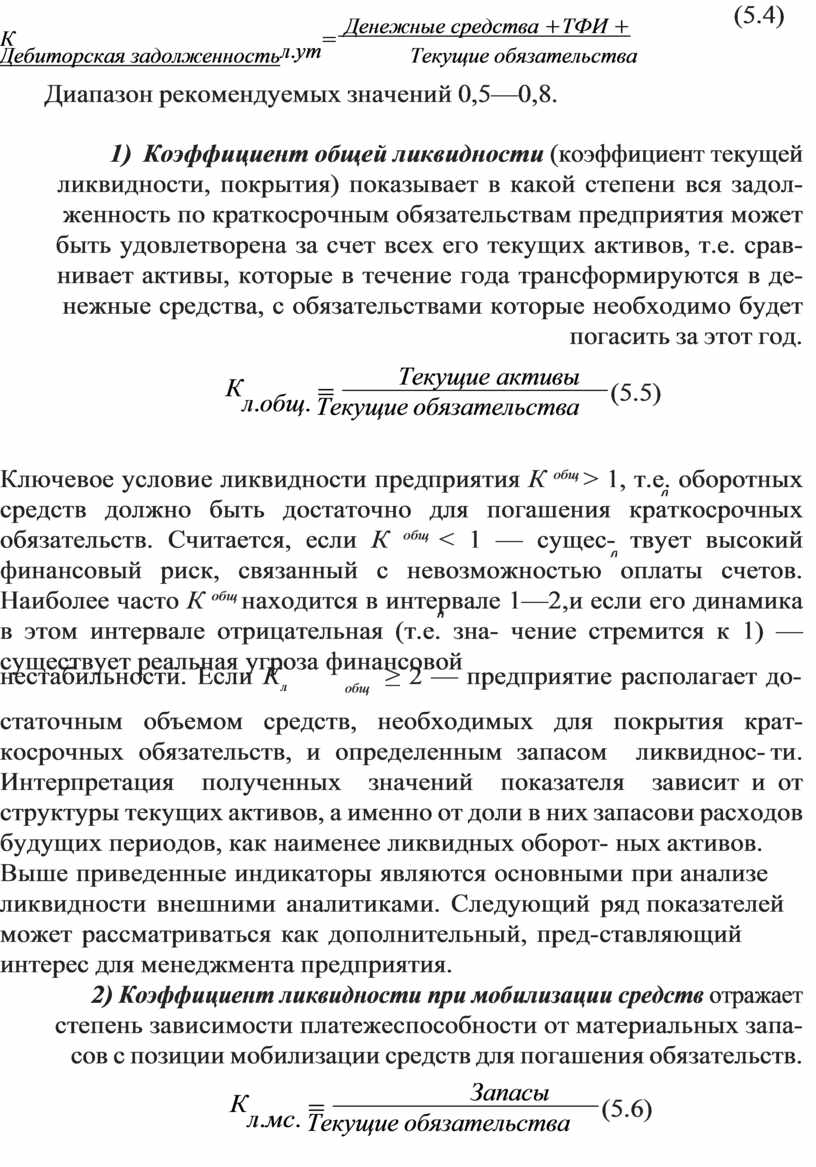 4) Коэффициент ликвидности при мобилизации средств отражает степень зависимости платежеспособности от материальных запа- сов с позиции мобилизации средств для погашения обязательств.