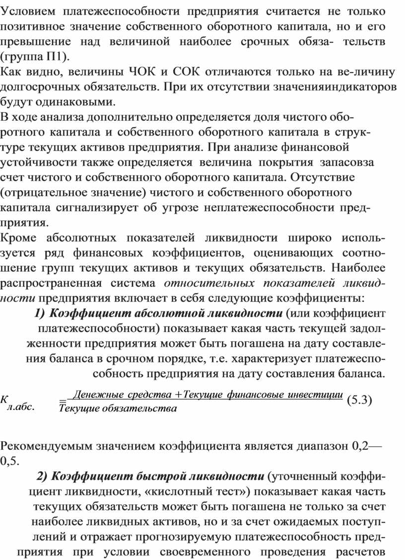 1) Коэффициент абсолютной ликвидности (или коэффициент платежеспособности) показывает какая часть текущей задол- женности предприятия может быть погашена на дату составле- ния баланса в срочном порядке, т.е. характеризует платежеспо- собность предприятия на дату составления баланса.