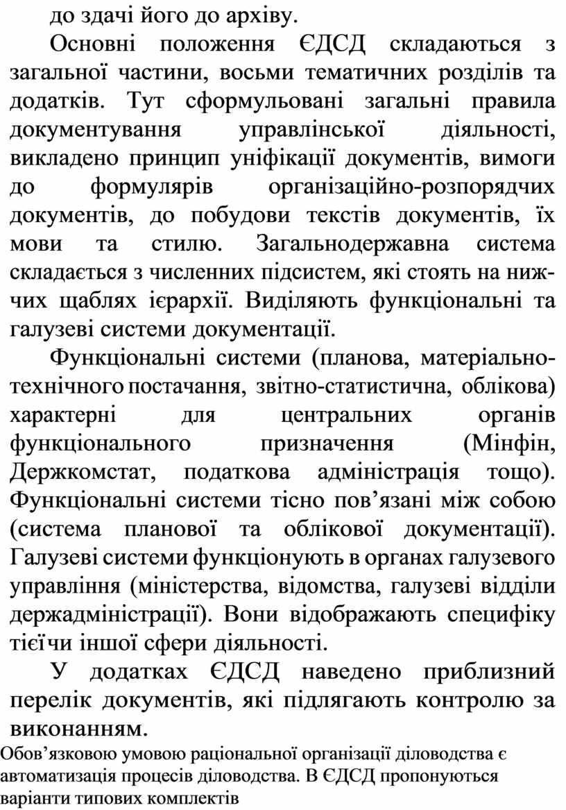 Значну роль у справі впорядкування роботи з документами, в оптимізації документаційних процесів у масштабі країни відіграє Єдина Державна система діловодства (ЄДСД). Це на- уково впорядкований комплекс правил, нормативів та рекомендацій щодо ведення діловодства, починаючи з надходження або створення документа до здачі його до архіву.