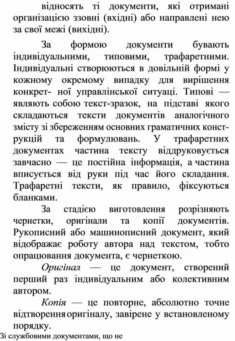 За формою документи бувають iндивiдуальними, типовими, трафаретними. Iндивiдуальнi створюються в довiльнiй формi у кожному окремому випадку для вирiшення конкрет- ної управлiнської ситуацi. Типовi — являють собою текст-зразок, на підставі якого складаються тексти документiв аналогiчного змiсту зi збереженням основних граматичних конст- рукцiй та формулювань. У трафаретних документах частина тексту вiддруковується завчасно — це постiйна iнформацiя, а частина вписується вiд руки під час його складання. Трафаретнi тексти, як правило, фiксуються бланками.