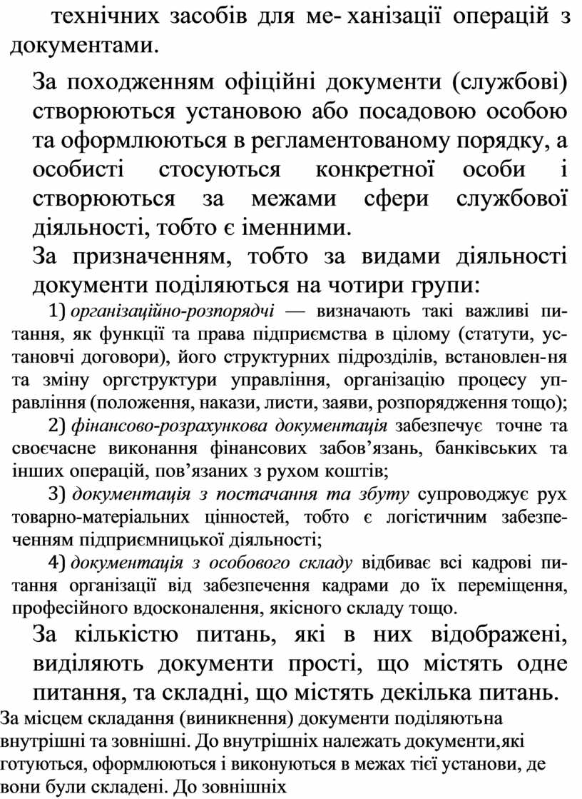 За призначенням, тобто за видами дiяльностi документи подiляються на чотири групи: