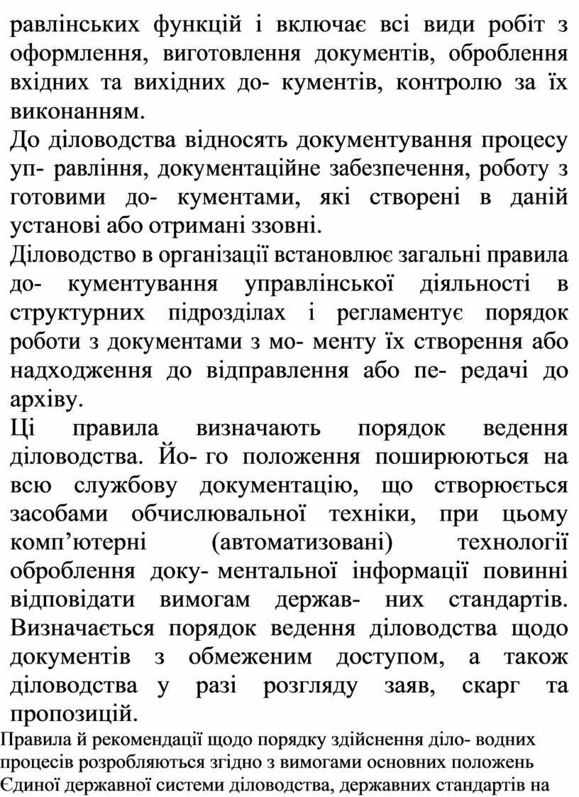 Правила й рекомендації щодо порядку здійснення діло- водних процесів розробляються згідно з вимогами основних положень Єдиної державної системи діловодства, державних стандартів на організаційно-розпорядчу документацію та нормативних актів і методичних рекомендацій Головного архівного управління щодо організації документального за- безпечення.