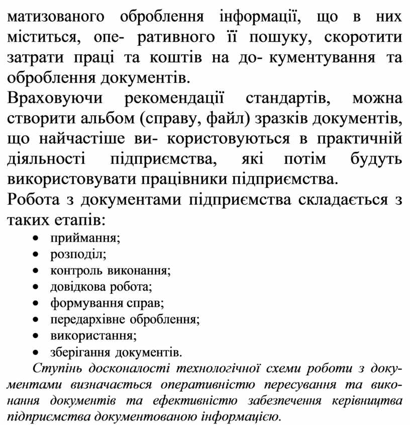 Ступінь досконалості технологічної схеми роботи з доку- ментами визначається оперативністю пересування та вико- нання документів та ефективністю забезпечення керівництва підприємства документованою інформацією.