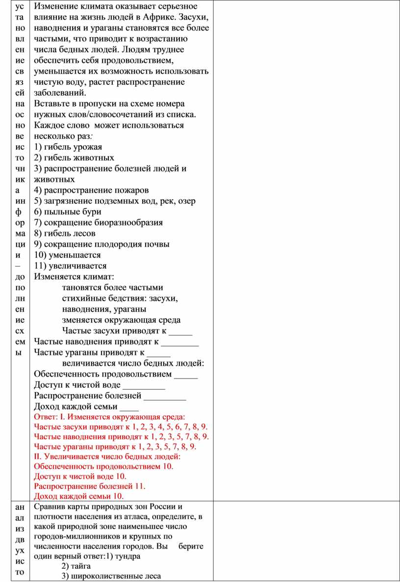 Изменение климата оказывает серьезное влияние на жизнь людей в Африке. Засухи, наводнения и ураганы становятся все более частыми, что приводит к возрастанию числа бедных людей. Людям труднее обеспечить себя продовольствием, уменьшается их возможность использовать чистую воду, растет распространение заболеваний. Вставьте в пропуски на схеме номера нужных слов/словосочетаний из списка. Каждое слово может использоваться несколько раз: 1) гибель урожая 2) гибель животных 3) распространение болезней людей и животных 4) распространение пожаров 5) загрязнение подземных вод, рек, озер 6) пыльные бури 7) сокращение биоразнообразия 8) гибель лесов 9) сокращение плодородия почвы 10) уменьшается 11) увеличивается Изменяется климат: 1. Становятся более частыми стихийные бедствия: засухи, наводнения, ураганы 2. Изменяется окружающая среда Частые засухи приводят к _____ Частые наводнения приводят к ________ Частые ураганы приводят к _____ 3. Увеличивается число бедных людей: Обеспеченность продовольствием _____ Доступ к чистой воде _________ Распространение болезней _________ Доход каждой семьи ____ Ответ: I. Изменяется окружающая среда: Частые засухи приводят к 1, 2, 3, 4, 5, 6, 7, 8, 9. Частые наводнения приводят к 1, 2, 3, 5, 7, 8, 9. Частые ураганы приводят к 1, 2, 3, 5, 7, 8, 9. II. Увеличивается число бедных людей: Обеспеченность продовольствием 10. Доступ к чистой воде 10. Распространение болезней 11. Доход каждой семьи 10. |