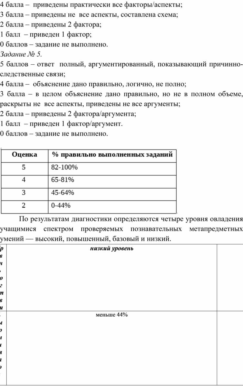По результатам диагностики определяются четыре уровня овладения учащимися спектром проверяемых познавательных метапредметных умений — высокий, повышенный, базовый и низкий.